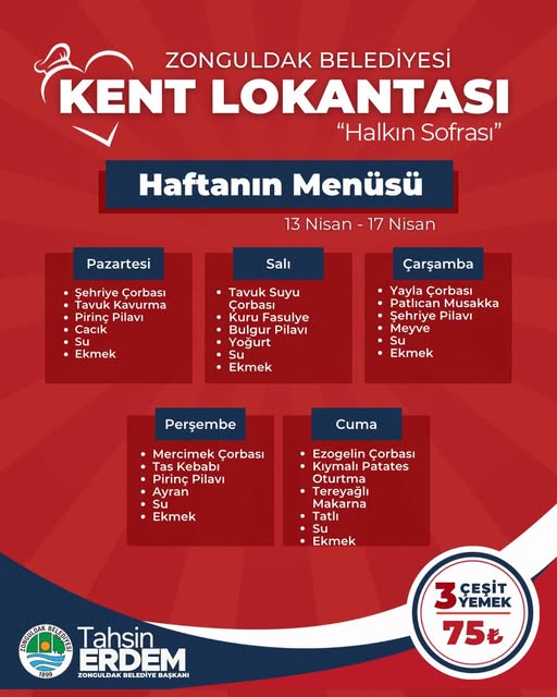 Zonguldak Belediyesi tarafından hizmete sunulan Kent Lokantası’nda 13-17 Nisan tarihleri arasını kapsayan haftalık menü duyuruldu. “Halkın Sofrası” anlayışıyla uygun fiyatlı yemek hizmeti sunan lokantada, 3 çeşit yemek 75 TL’den vatandaşlara sunulacak.